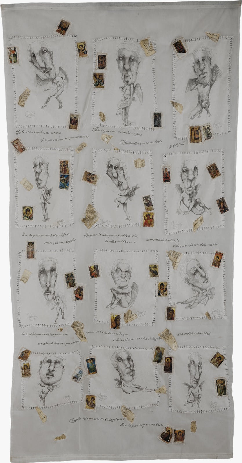 Voile di tela, grafite, cuciture, trasferimento su sacchetti di tè e applicazioni di testi